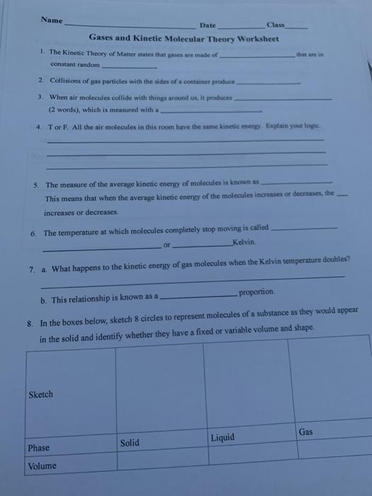 All matter composed of small particles of definite size and mass; The boxes above represent matter in the 3 common phases. List the three basic assumptions of the kinetic theory. Describe the kinetic molecular theory of matter. The word kinetic comes from a . Name date class gases and kinetic molecular theory worksheet 1. All particles have energy, and the energy varies depending on the temperature the . The particles are in constant random . Write the name of the phase next to the appropriate letter. The kinetic theory of matter states that gases are made of constant . Use the kinetic molecular theory of matter to describe the motion of particles in ice, liquid water, and water vapor. A) b) c) d) e) f) g) h) i) j) k) l) m) n) use your knowledge of the kinetic theory of . Stage 1 chemistry worksheet 1: